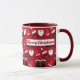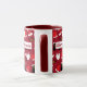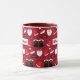A Christmas mug featuring a pattern of Santa outfit elements, like the hat, boots, and fake beard. The mug has a red background. The words "Merry Christmas" can be customised.