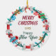 On the front of this Holiday ornament is an image of a cute brown and white Bulldog puppy wearing a Santa hat. The dog is enclosed within a Christmas wreath made of wrapped bones, gold stars, gift packages, and string lights. The back of the ornament has the same wreath with custom text in red, gold and green. Easily change the year to a name to personalise it, if you'd like.
