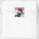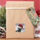 A charming furry Santa Claus hat resting on a rustic fence post, beautifully set against the backdrop of a swirling snowstorm
