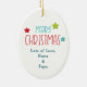 On the front of this keepsake ceramic ornament for a child is an adorable polar bear cub wearing a Santa hat. The background is a pretty teal green and white abstract bokeh pattern. Your child's name is at the bottom. The back of the ornament has a Merry Christmas message and your signature. Perfect for a daughter, son, granddaughter or grandson, especially one who loves bears!