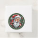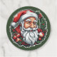 Sticker with Santa's head and a beautiful Christmas wreath. Digitally created in a colorful cartoon style.