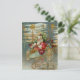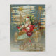 Here comes Santa! He is steering his amazing flying machine through the night sky. Stars, streamers and fancy decorations bedeck the aircraft and its load of wonderful toys for Christmas morning. The restored image of a Victorian postcard features a frosty background, gold accents and beautiful, bright colours. It is framed in icicles and ornaments with a Christmas village in the background.