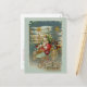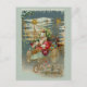 Here comes Santa! He is steering his amazing flying machine through the night sky. Stars, streamers and fancy decorations bedeck the aircraft and its load of wonderful toys for Christmas morning. The restored image of a Victorian postcard features a frosty background, gold accents and beautiful, bright colours. It is framed in icicles and ornaments with a Christmas village in the background.