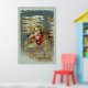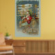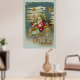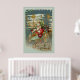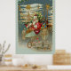 Here comes Santa! He is steering his amazing flying machine through the night sky. Stars, streamers and fancy decorations bedeck the aircraft and its load of wonderful toys for Christmas morning. The restored image of a Victorian postcard features a frosty background, gold accents and beautiful, bright colours. It is framed in icicles and ornaments with a Christmas village in the background.
