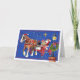 Christmas Santa on a wagon full of presents being pulled through a blue star-studded sky by a Clydesdale horse and a and a black cat with a Tam O'Shanter Scottish cap.