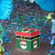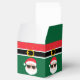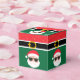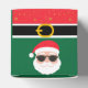 Santa Claus looking super cool wearing sunnies, set against a green background with his belt above and a red gold star pattern