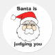 "Santa is judging you" funny slogan Christmas stickers with suspicious looking Santa cartoon.