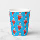 Fun Christmas paper cups with a pattern of manatees in Santa outfits on a blue background.