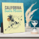 Modern word art features California in distressed grey font with Santa Monica in a modern aqua script font with geometric palms and mountains logo style graphic on pale yellow background