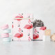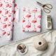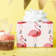 Novelty Christmas wrapping paper with a pattern of pink flamingos in Santa outfits on a pink background.