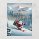 Santa rides skis down a snow-covered slope, leaving a trail behind him as the crisp winter air rushes past him.