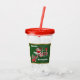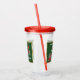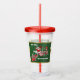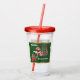 This acrylic drink tumbler with straw and lid has Santa Claus riding a peppermint candy train carrying letters and candy canes on a dark green background with a shiny gold border. Text says Choo, Choo, Here Comes Santa on the front and back.