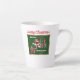 This Latte mug has Santa Claus riding a red and white train with peppermint candy wheels carry letters and candy canes on a green background with the text: Choo, Choo Here Comes Santa with a gold border. Customise the Merry Christmas text at the top with the template.