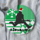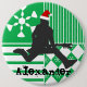 This cool button is a great way to tag and identify which stocking belongs to which family member on Christmas morning. Use the button every year and make it a Christmas tradition and keepsake. Design features a green background with white stripes, snowflakes and argyle patterns. There is a black silhouette of a rock star playing his guitar and jumping in the air. The rock star is hearing a red Santa Claus hat. Below the rock star is a place for personalisation in black funky font. Simply add the name or text that you wish and you have a personalised Christmas stocking name tag.