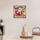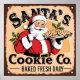 A rustic sign featuring Santa holding a tray of cookies, with vintage fonts reading “Santa’s Cookie Co. - Baked Fresh Daily.” The background shows holly leaves and warm hues.