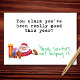 Bring some sarcastic cheer to the holidays with this funny Christmas card featuring the line, “You claim you’ve been really good this year? Yeah, Santa’s not buying it.” A grumpy, unimpressed Santa lounging beside a stack of presents makes the perfect match for this witty punchline. A lighthearted way to poke fun at friends, coworkers, or family, this card is blank inside so you can add your own personal message.