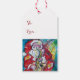 Colourful ,whimsical,fun Santa Claus is playing saxophone with musical notes in vibrant red,yellow,blue,white colours,mixed media painting by Bulgan Lumini (c)