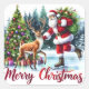 Santa Claus enjoys a festive moment skating while greeting a reindeer. Surrounded by beautifully decorated Christmas trees and colourful gifts, this cheerful scene captures the joyful spirit of the holiday season in a wintry wonderland.