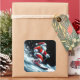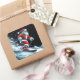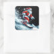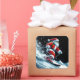 Dressed in a classic red suit with a white beard, Santa Claus is skiing down a snowy slope surrounded by glistening snowflakes and majestic mountains. The cheerful scene captures the spirit of winter sports during the Christmas season.