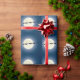 This patriotic military holiday Christmas wrapping features Santa Claus and his sleigh pulled by a team of F-16 Fighting Falcon jets with a full moon background. -