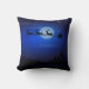 Reversible Christmas Throw Pillows featuring a sillhouette of Santa and his sleigh being pulled by reindeer against a midnight blue starry night sky with a moon shining in the background. On the back side is a sillhouette of a Christmas tree and a black and midnight blue starry sky. With two pillows you can display both sides together at the same time.