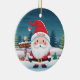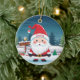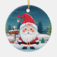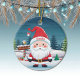 Santa, North Pole, St Nicholas, Kris Kringle, Father Xmas Ceramic Ornament with customizable name on his hat and featuring a North Pole white Christmas scene of winter wonderland snowy trees in the background. Unique cartoon whimsical character illustration graphic with wintry white snow landscape.