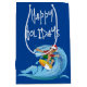 Surfer wearing a Santa Claus cap and surfing on a blue wave.