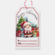 Delightful Christmas tags feature a cheerful Santa holding a cup, surrounded by beautifully wrapped gifts and a decorated tree, perfect for holiday gifting and spreading joy.