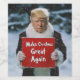 A humourous holiday image featuring a Donald Trump dressed in a Santa suit, holding a red sign that reads, “Make Christmas Great Again.” Snowflakes fall around him, adding to the festive winter atmosphere. The text and expression convey a blend of seasonal spirit and a lighthearted nod to political slogans