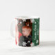 Personalise this festive Christmas coffee or hot cocoa mug with two favourite photos and custom "Santa Visit" + Year text. Design features a white winter snowflake border pattern. Hunter green background colour can be customised to coordinate with your photo design.
