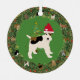 Keep the Santa Wire Fox Terrier image shown, or upload your dog's photo at the prompt for a beautiful and personal Christmas ornament. You will want to keep this memory saver forever. Make one for each member of the family. Don't forget your cat, parrot or other furry or feathered loved one. The lovely Christmas Wreath dotted with red yew berries will serve as a frame for the image you choose. This dog themed wreath includes 12 cartoon style dogs arranged in a circle. You can edit to resize or remove any image. On the back is "Grateful for our good fortune" You can keep the existing text, or replace it.