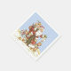 This paper napkin has a cute Santa Claus walking in the falling snow holding a lit lantern surrounded by happy children.