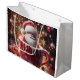 A charming and whimsical image depicting a miniature Santa Claus nestled inside a giant, steaming mug of hot cocoa. The mug is adorned with delicate snowflakes and dripping with creamy goodness. Santa, with his rosy cheeks and twinkling eyes, peeks out from the warmth, surrounded by the soft glow of Christmas lights and festive decorations.