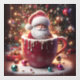 A charming and whimsical image depicting a miniature Santa Claus nestled inside a giant, steaming mug of hot cocoa. The mug is adorned with delicate snowflakes and dripping with creamy goodness. Santa, with his rosy cheeks and twinkling eyes, peeks out from the warmth, surrounded by the soft glow of Christmas lights and festive decorations.