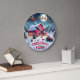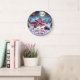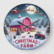 Experience the charm of a countryside Christmas with this delightful farmhouse-themed wall clock. The design features a joyful Santa Claus arriving at a cosy, snow-covered red barn, perhaps even on a festive tractor, amidst friendly farm animals. This rustic timepiece captures the essence of a peaceful winter night, illuminated by soft glow and twinkling stars. Perfect for holiday decor, it blends traditional celebration with rural charm, making it a unique gift idea for family. This cheerful illustration embodies the heartwarming spirit of the season, bringing cosy festive vibes to any home.