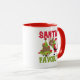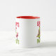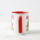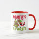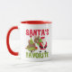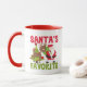 Cute, colourful Christmas holiday design mug featuring red and green text that reads Santa's Favourite, and Santa Claus, a Christmas tree, and a reindeer!