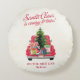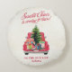 A festive holiday pillow featuring the words "Santa Claus is coming to town" in a fun typeface with a watercolor rustic truck filled with gifts, Christmas tree and Santa hat.