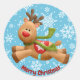 This lovely sticker features a cute illustration of Rudolph, the red nosed reindeer, set against a snowflakes pattern on a blue background.