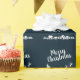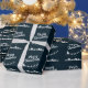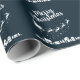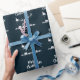 This elegant dark blue Christmas wrapping paper features the silhouette of Santa's sleigh with his reindeers, flying above the houses in a trail of stars.