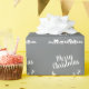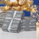 This elegant silver-grey Christmas wrapping paper features the silhouette of Santa's sleigh with his reindeers, flying above the houses in a trail of stars.