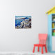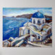 painting of a black cat perched on a whitewashed church in beautiful Santorini, Greece.