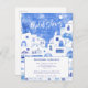 A modern watercolor painting of the picturesque town of Oia on the Greek island of Santorini to celebrate with a touch of elegance and beauty. Inspired by the stunning vistas of the island, these invitations feature a mesmerising watercolor painting of Oia in dreamy blue and white hues. Change the text to match your celebration. Original art by Nic Squirrell.
