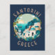 Santorini Greece illustration in a circle with distressed text. Santorini is instantly recognisable for its whitewashed, cube-shaped buildings adorned with blue accents, steep cliffs and tangerine sunsets that light up the sky and sea.