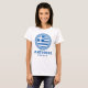Santorini, Greece distressed design women's white T-Shirt featuring the national flag of Greece inside a Greek blue Aztec circle and the name of the island written in Greek style. This T-Shirt is ideal for you to wear while you are enjoying your vacation on the beautiful Greek island of Santorini. You can also give this as a gift from Greece to anyone who will like this T-Shirt.
