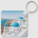 Santorini scene featuring iconic blue-domed churches and whitewashed buildings.