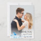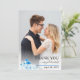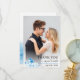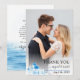Santorini Greece watercolor landscape destination wedding Thank You photo card. Show your appreciation to the special people who joined you for your magical destination wedding in Santorini, Greece, with these elegant watercolor Thank You photo cards. Each card fetures a treasured photograph from your wedding day, alongside a detail of a beautiful watercolor illustration that evokes the spirit of the island. The design presents a picturesque, scene of Santorini, featuring the iconic white-washed buildings. The card captures the essence of a romantic Greek getaway, reminding everyone of those stunning unique architectural charm that defines Santorini. The back includes the blue sea the sky with seagulls. These cards are a heartfelt way to express your gratitude and share a lasting piece of the Santorini experience with those you love.