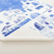 A blue and white watercolor painting of the village of Oia on the Greek island of Santorini.