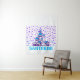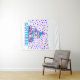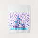 This image depicts a cartoon illustration of the iconic white-washed buildings of Santorini, Greece. The houses are clustered together and feature blue accents, reflecting the traditional architecture of the island. The background is filled with a scattering of purple stars, creating a whimsical and playful atmosphere. The word "SANTORINI" is written in bold, blue letters at the bottom of the image, further emphasising the theme. This image is a colourful and cheerful representation of the beautiful and popular tourist destination.
