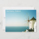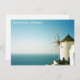 Watercolour-style image of a windmill on the edge of the caldera in Oia, on the Greek island of Santorini