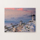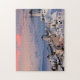 Challenging puzzle of Santorini's coast. Beautiful sunset.